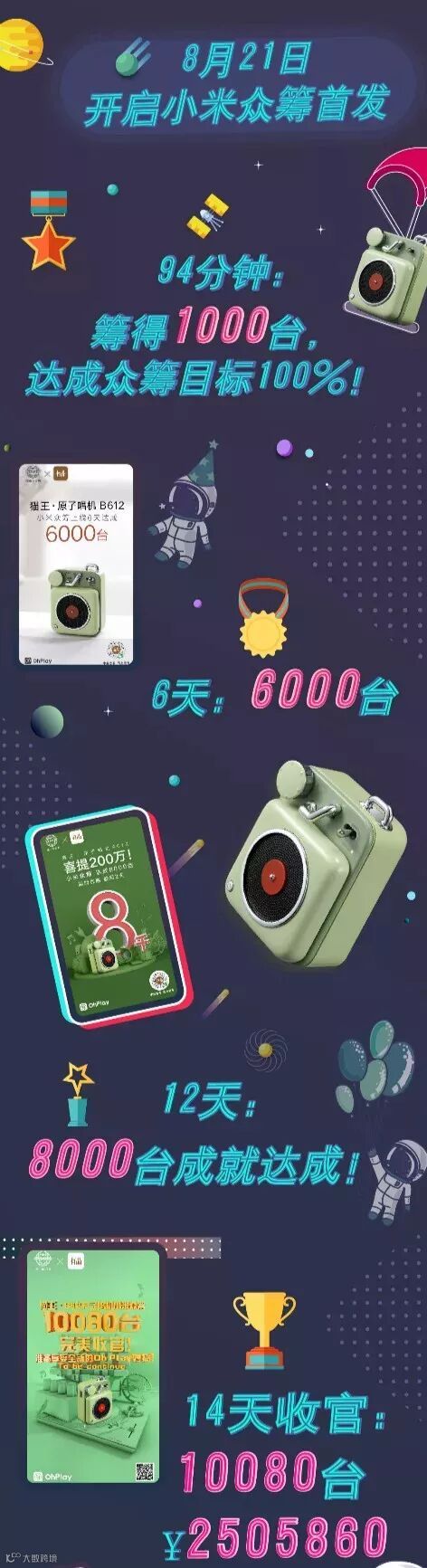 8月21日,猫王携手有品展开小米众筹,94分钟即达成100%目标,最终以14天10080台的惊人成绩在小米有品平台创下辉煌。