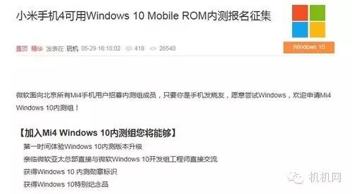今年三月份,微软宣布将为小米4用户推出Win 10刷机包,如今微软开始践行当时的承诺了。目前,微软已经在小米社区面向北京所有小米4手机用户招募Win 10内测组成员。