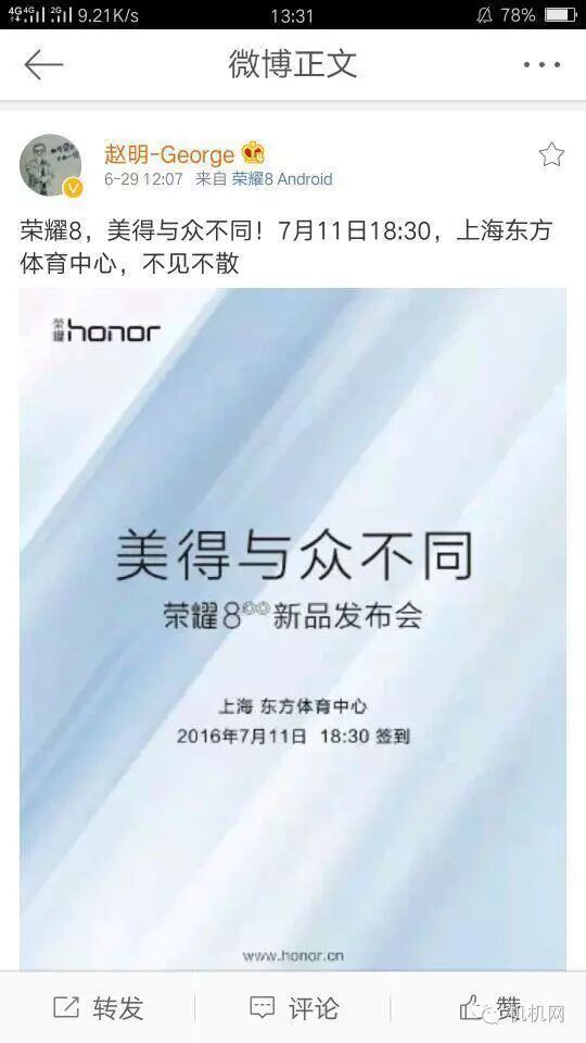 6月29日消息,这几天有关荣耀8的各种新闻都陆陆续续曝光,但其官方一直未给出准确消息究竟何时发布。然而就在刚刚,华为荣耀业务部总成@赵明-George发微博表示荣耀8将于7月11日18点30分在上海东方体育中心举行。