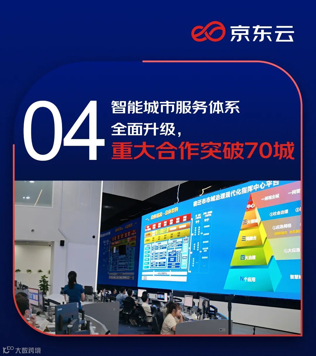 京东智能城市首提“五网融合”智能城市理念。数字政府业务立体化突破,全国机关事务云平台、北数所交易系统等试运行,市域治理现代化实现北京、上海等多城落地;数字经济业务持续推进,重大合作城市增至70城,首发京东科技乡村数智化解决方案,服务服贸会等多省市数智会展;数字生活业务持续升级,发布城市消费促进平台,在城市消费、商文旅融合、便民服务、工会普惠等方面惠及民生。持续构建差异化生态能力体系,以紧密的技术生态合作,高效赋能城市数智化升级。