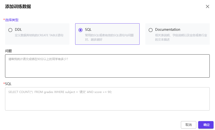 SQL 数据类型用于提供常用的 SQL 查询语句,这些语句帮助系统快速理解并执行特定的数据库查询操作。用户可以提供 SQL 查询语句和对应的问题,越多有效的 SQL 语句将有助于训练的效果。