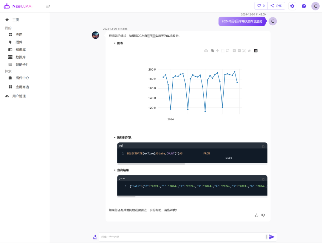 NebulaAI 便会根据描述自动识别并执行合适的 SQL 查询,并给出执行的SQL语句以及查询结果。