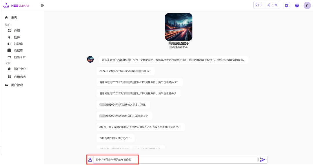 无需繁琐的输入,只需简单描述需求,以某省级高速稽查助手为例,用户仅需输入自然语言描述需求。
