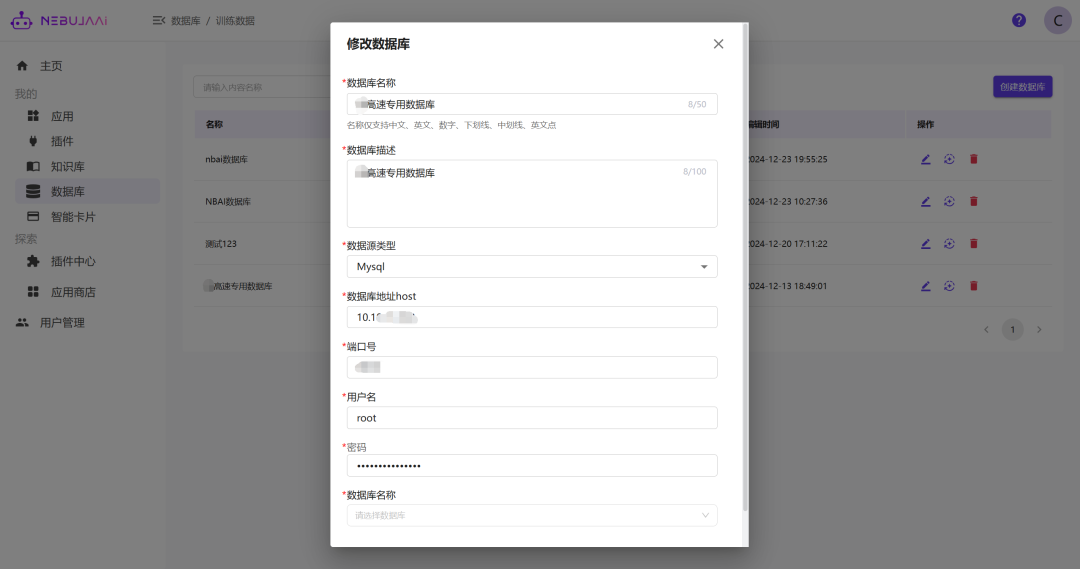 在 NebulaAI 平台上,创建和管理数据库变得前所未有的简单。用户只需提供以下基本信息,即可完成数据库的创建: