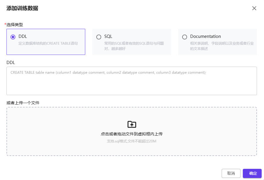 DDL 用于定义数据库的结构,主要包括数据库表的创建语句(CREATE TABLE)。上传 .sql 文件或手动输入相关 DDL 语句可以帮助系统理解数据库的表结构和字段信息。