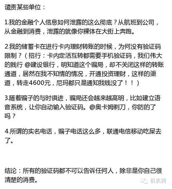 囡囡这里想多嘴问一句,你一个运营可能看不到信息,那么你能保证其他渠道不能泄露?不管京东还是淘宝还是其他商家,很多人被骗就是因为骗子的确准确说出了他们的订单信息!电商内部到底有无泄露信息,该查查了!有网友提出了和囡囡一样的看法,银行的提示信息不够全面详细!
