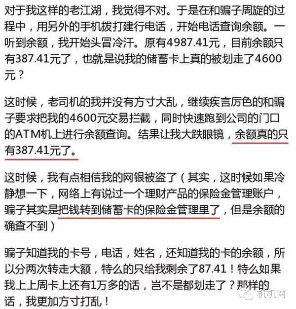 3、你转钱到投资理财账户的时候银行肯定会给你发信息,告诉你钱转出去了,这是正常的。但是仅仅是告诉你钱转出去的,转到哪里去了,银行并未告诉你!如果在这步银行多写几个字,写明转出去的目的地,这个骗术就很难成功了!