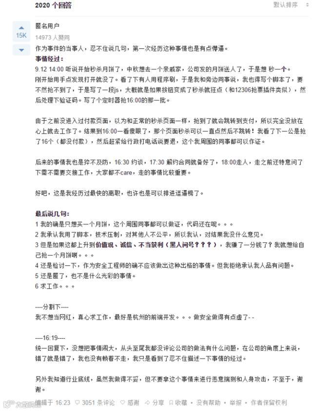 统一回复下,没想把事情闹大,从头至尾我都没评论公司的做法有什么问题,在公司的角度上来说,错了就是错了,我也没有赖着不走,我只是看到了忍不住描述一下事情的经过。