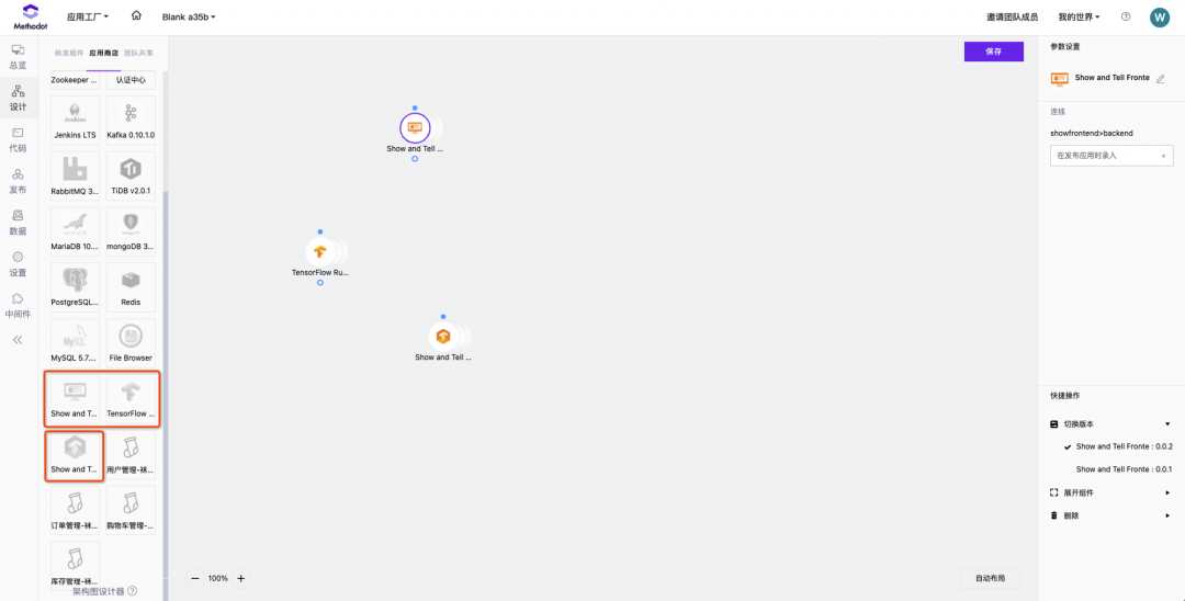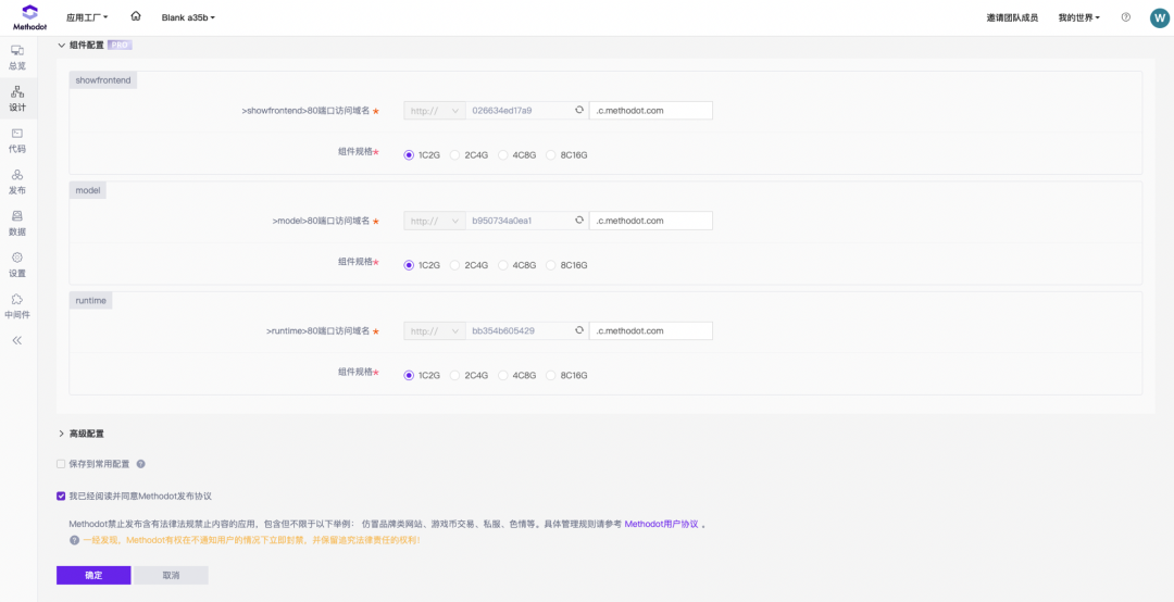 架构图设计完成,点击“保存按钮”,并选择发布,跳转到发布页面,按照默认配置发布应用;