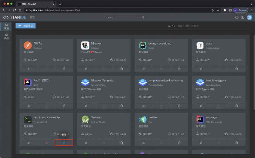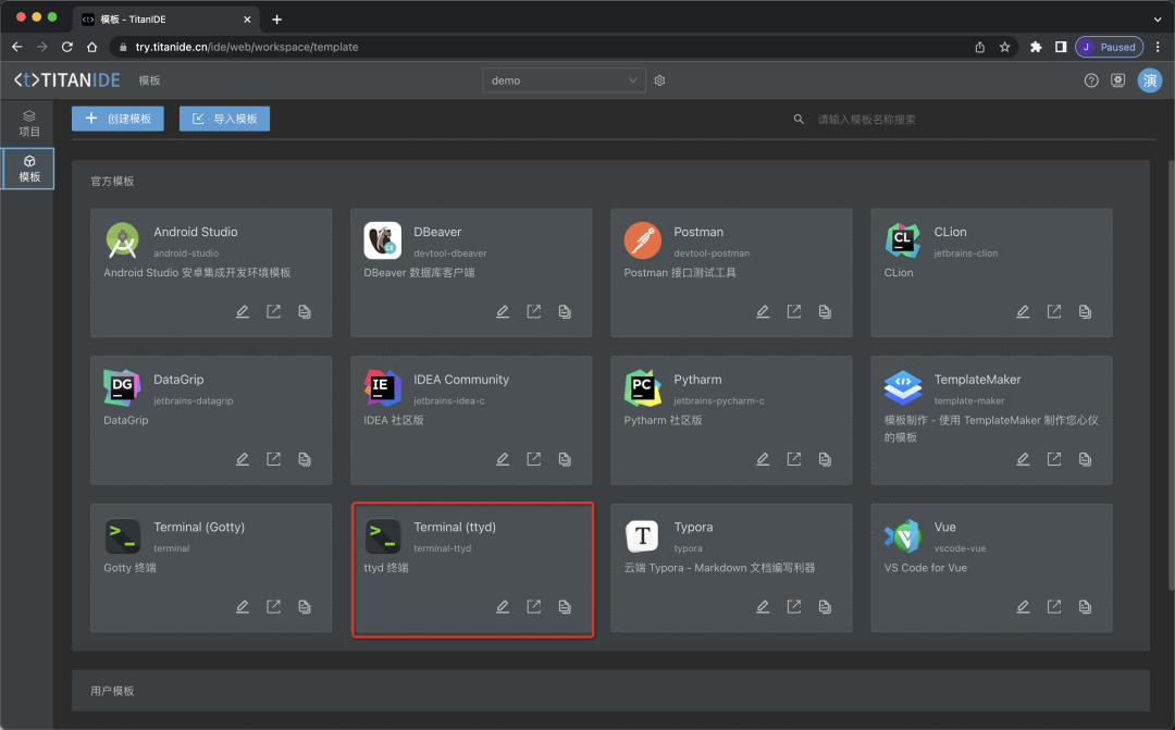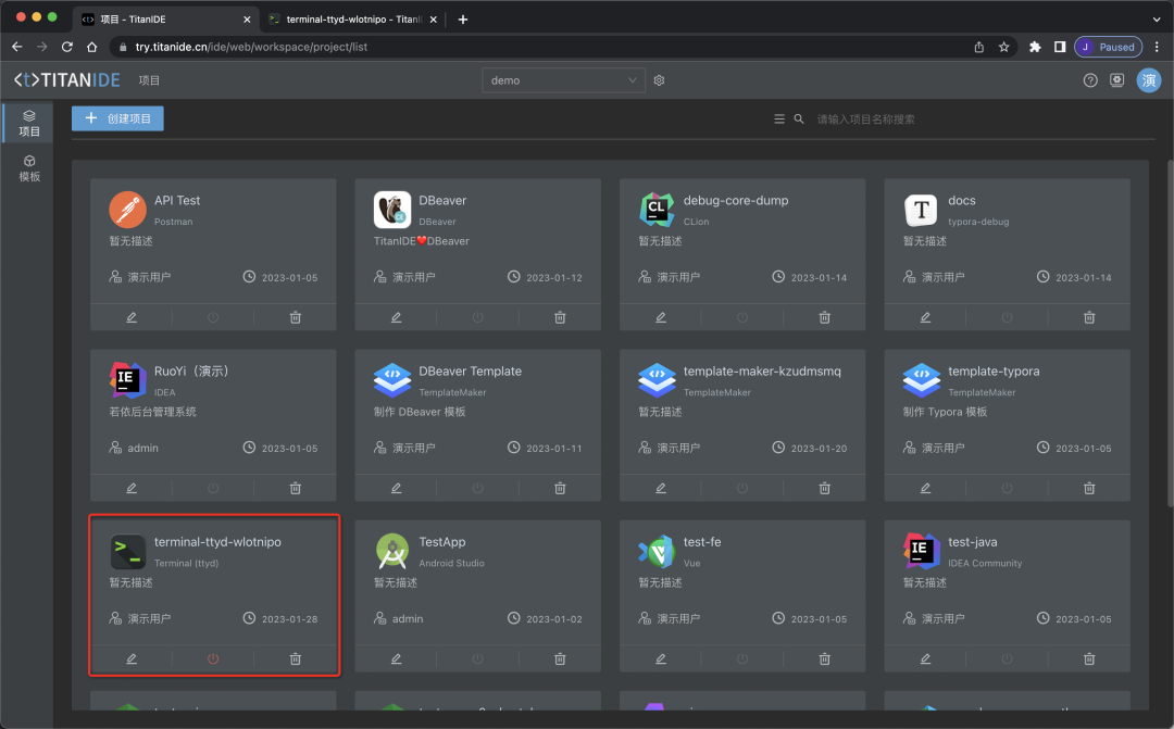 在 TitanIDE 创建一个独立的 Terminal 用于执行本文接下来的所有的操作,这些操作在独立的环境中执行,请放心大胆地使用。