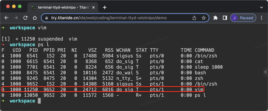 此时,ps l 会告诉您编辑器进程当前处于 stopped state (“T”)。