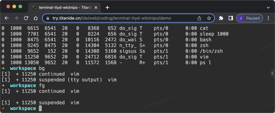 此时的情况是,line discipline 子系统会立即向前台进程组发送 SIGTSTP 信号。这个进程组中包括编辑器进程,以及它创建出来的任何子进程。如上图所示,vim 被挂起。
