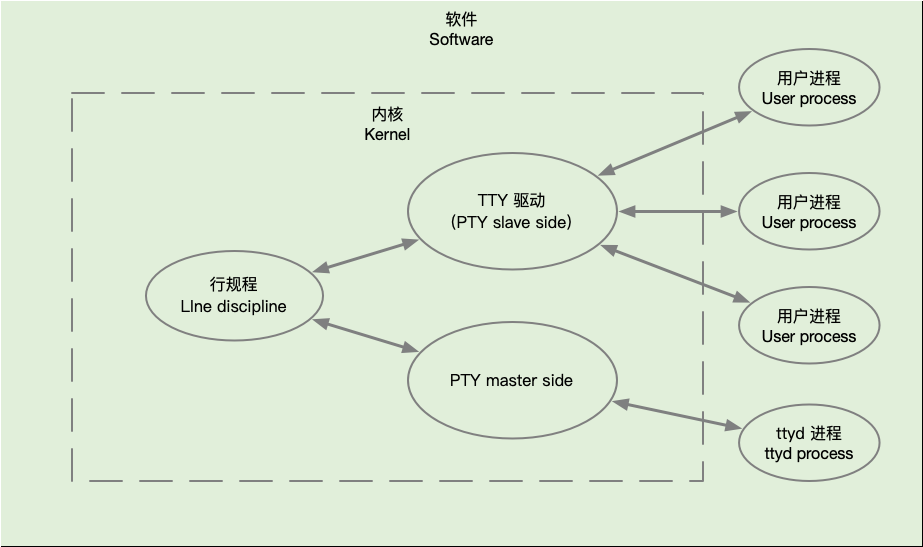 为了方便将终端模拟移到用户空间且同时保持 TTY 子系统(会话管理和 line discipline)的完整性,人们引入了伪终端(pseudo terminal)或称 pty。您也许已经猜到了,当在伪终端内运行伪终端时(running pseudo terminals inside pseudo terminals),事情会变得更加复杂,例如 screen(1) 或 ssh(1)。