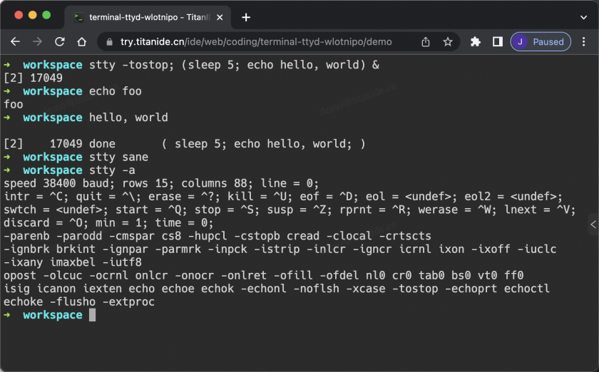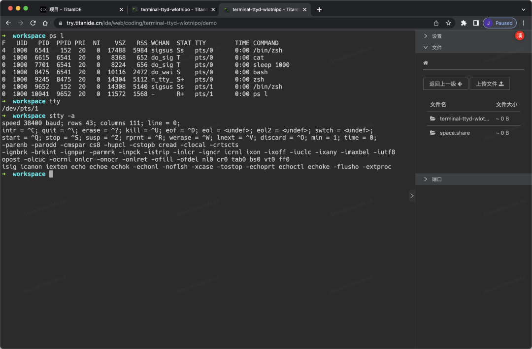 本文提供了 TTY 驱动和 line discipline 相关的知识,以及它们和终端、行编辑及作业控制的联系,通过在 TitanIDE上面创建一个 Terminal 进行快速实践。总的来说,在 TitanIDE 上面做这种测试最大的好处就是开箱即用,不用担心操作 Terminal 导致电脑损坏,用完后删除 Terminal 释放云资源。希望通过这种理论和实践相结合的方式,让大家对 Terminal 有更深刻的了解。