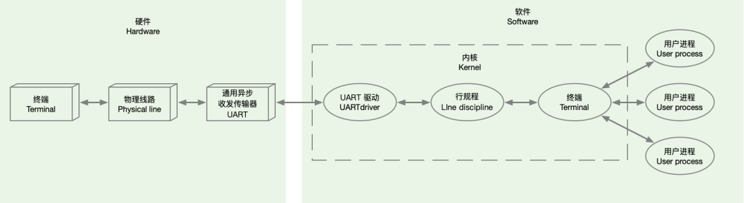现在让我们来更加近距离地看看内核中的 TTY 驱动、line discipline 和 UART 驱动 是如何与用户空间进程通信的。