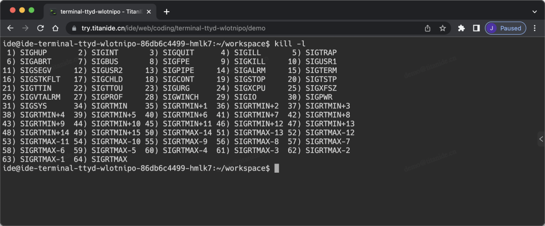 kill -l 命令可以查看当前系统已经实现了哪些信号。这个命令的输出可能与下面的类似 :