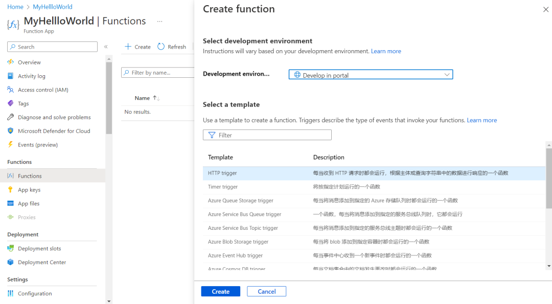 在Function App的上下文菜单内,创建一个function,选择HTTP Trigger,当你函数对应域名收到HTTP事件(GET,POST,UPDATE,DELETE)时函数会被执行,同时我们看到有大量的其他非HTTP事件可以订阅,比如:定时器执行函数或是每当消息被添加到RabbitQ时运行的函数等: