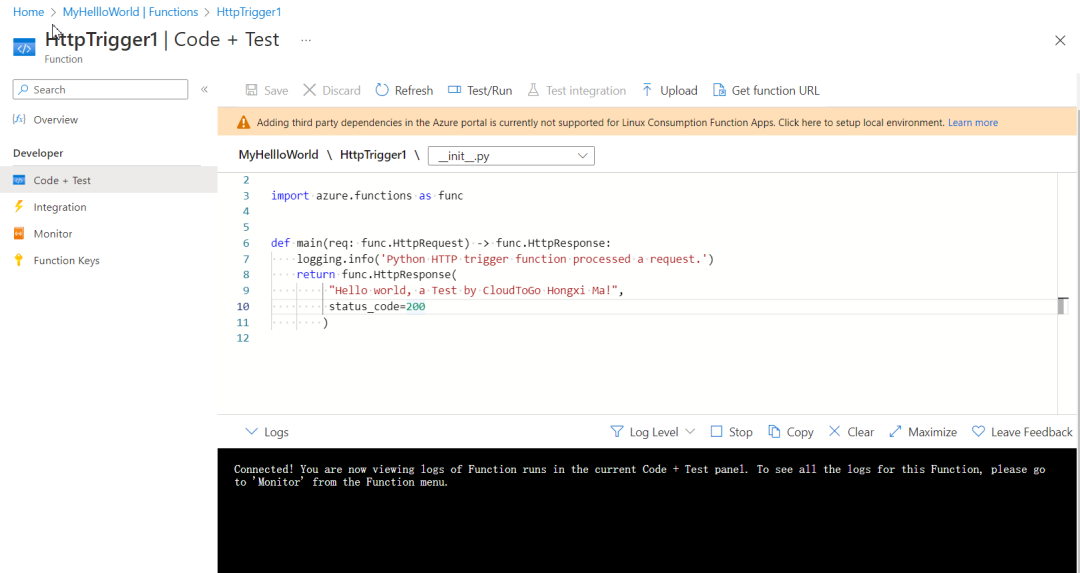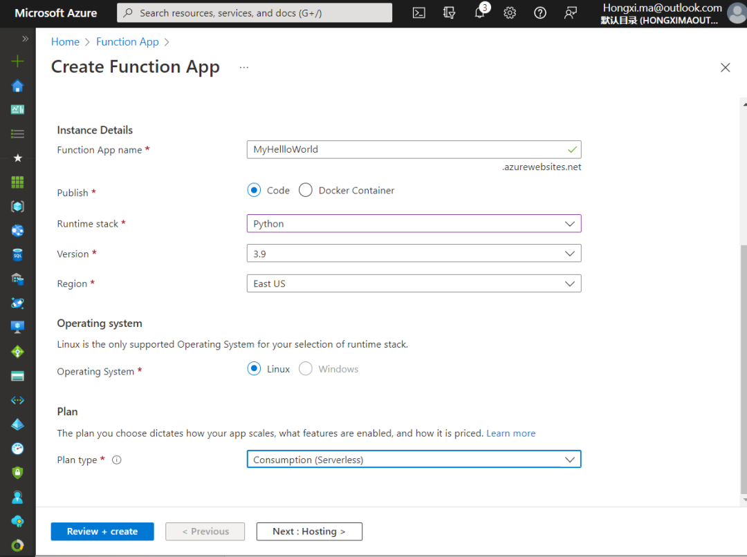 在Azure云上函数产品叫 Function App。创建一个Function App如下,我们选择采用Python编码: