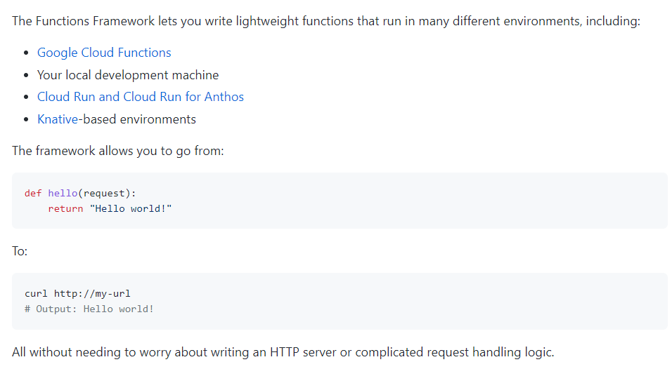 但为什么函数编程真的只有一个函数 def handler 就能运行呢?这不科学啊。其实他也没那么神秘。云平台本身是通过一个function-framework 或是叫bootstrap的框架把函数包起来,还是一个运行在容器里的完整的应用程序来执行的。不同云平台或是不同语言的实现方式可能有所不同,比如采用代码合成或是反射机制等。这里我们可以看看Google的一套开源实现: