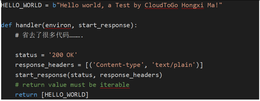 我们都知道原来写一个最简单的HTTP响应也得用Flask之类的库, 前后代码把函数框成一个完整的代码,程序才能跑得起来: