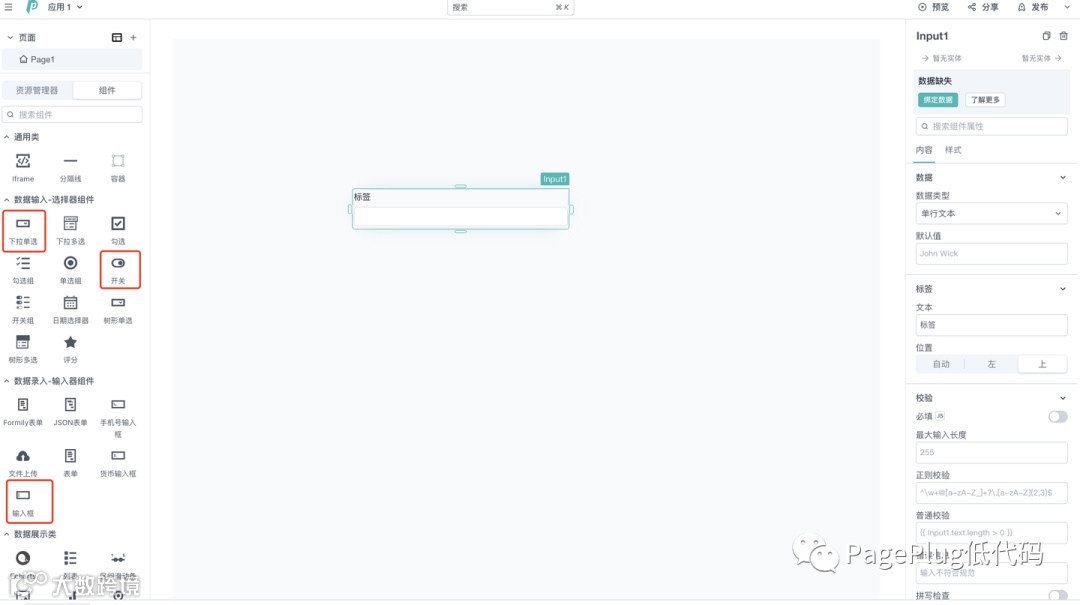 我们可以在左侧拖入文本(text)组件,输入框(input)组件、下拉单选(select)组件、开关(Switch)组件