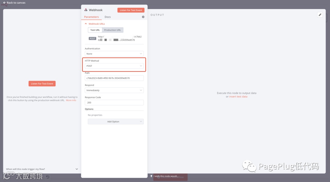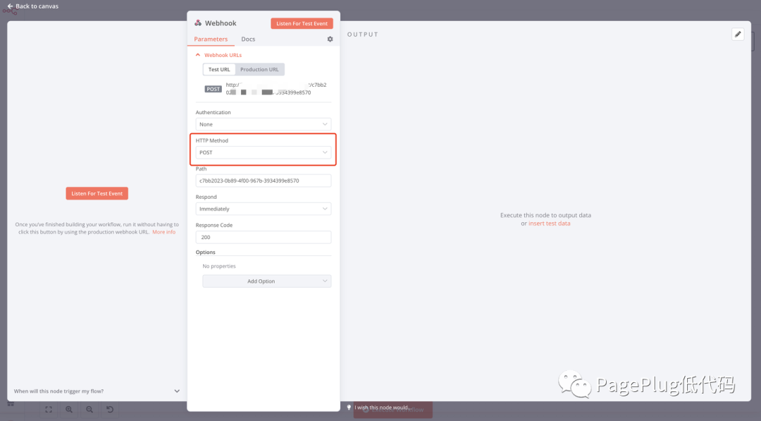 添加了Webhook组件后,将HTTP Method选项内容调整为POST