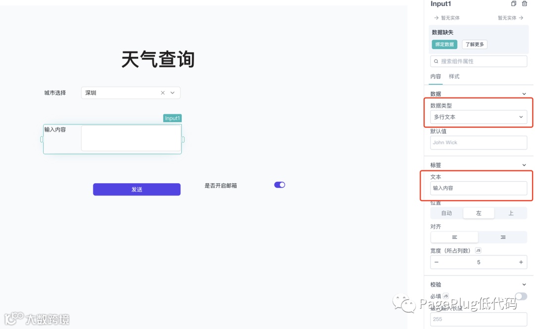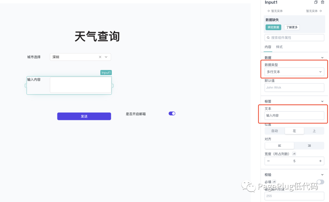 2)输入框组件可以修改下文案,例如:输入内容;数据类型选择多行文本