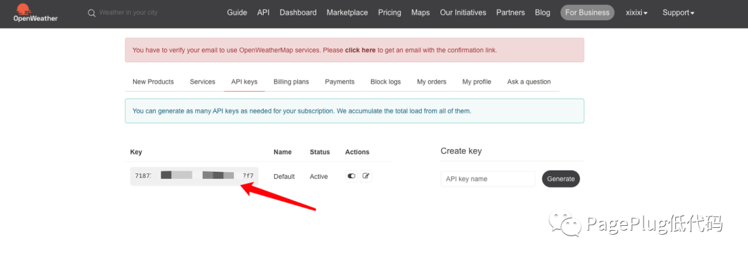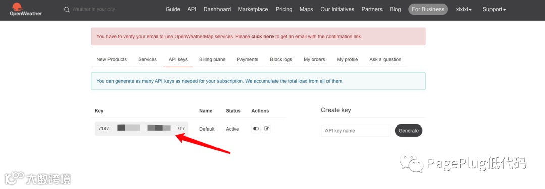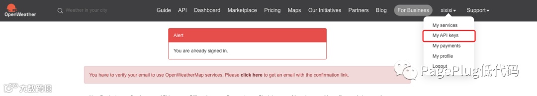 我们可以前往OpenWeather官网https://home.openweathermap.org/中获取API keys,在账号右上角中,选择My API Keys