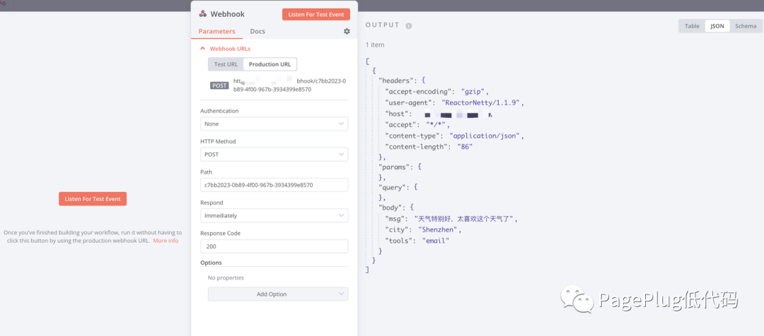 在Webhook组件中,将【Production URL】复制到PagePlug的api配置中,这样就可以不断的触发工作流状态了