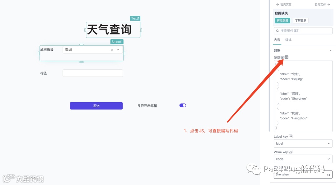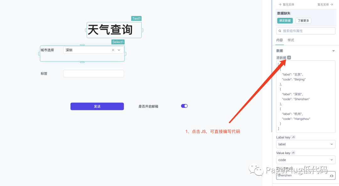 1)下拉单选组件的数据配置如下,文案也可以修改为:城市选择