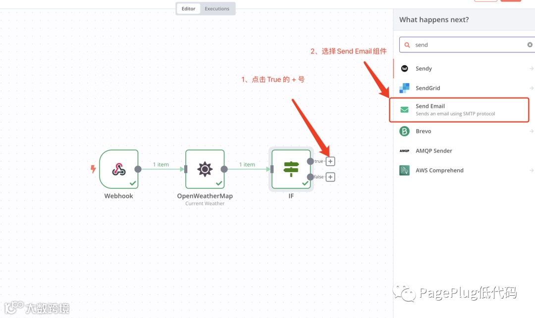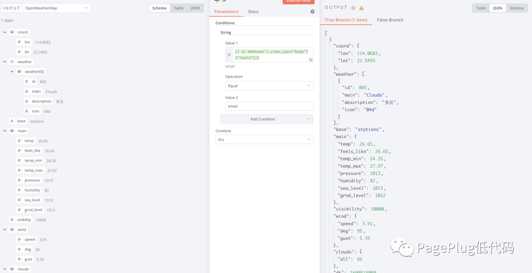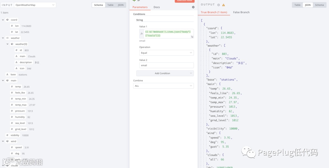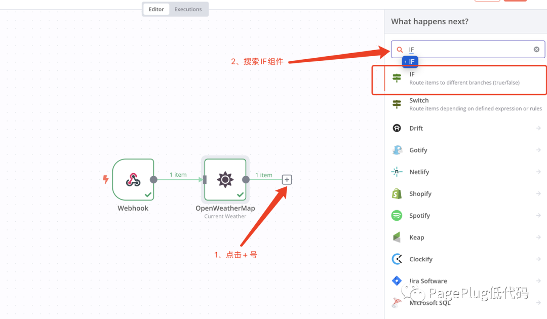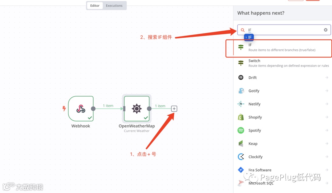 点击OpenWeatherMap组件旁边的+号,新增一个IF组件