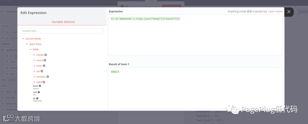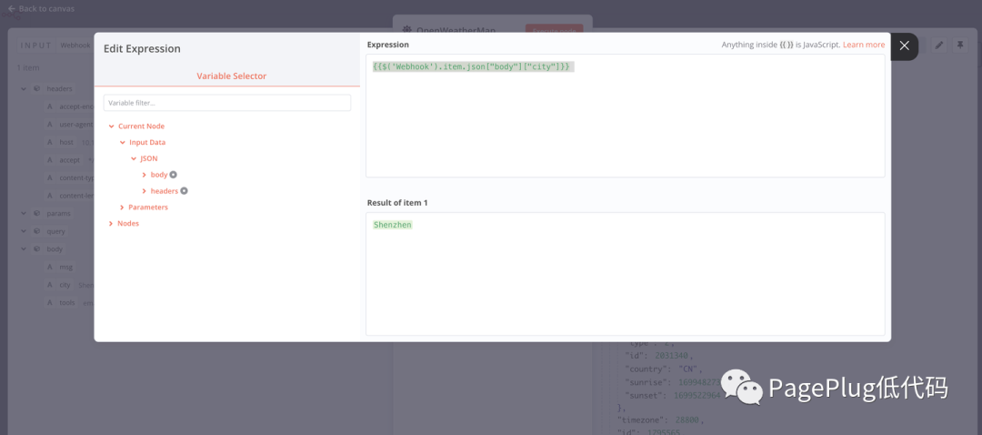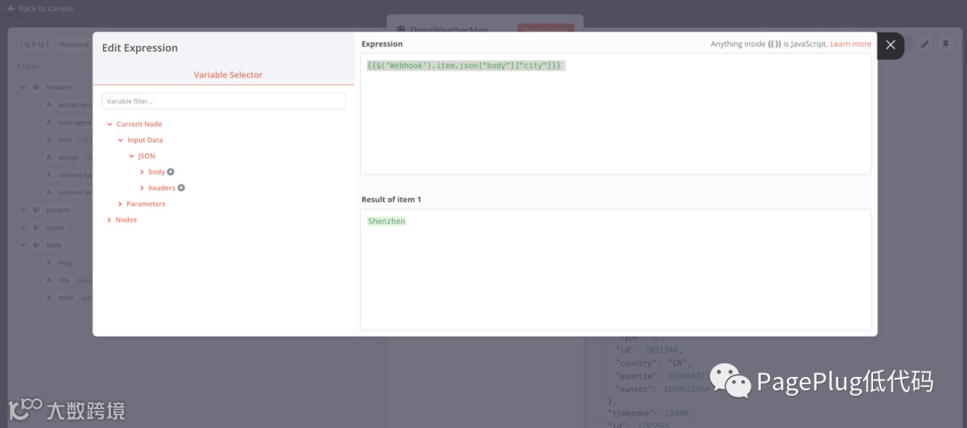 今天的天气是:{{$('OpetnWeatherMap').item.json["weather"][0]["description"]}},{{ $('Webhook').item.json["body"]["msg"] }}
