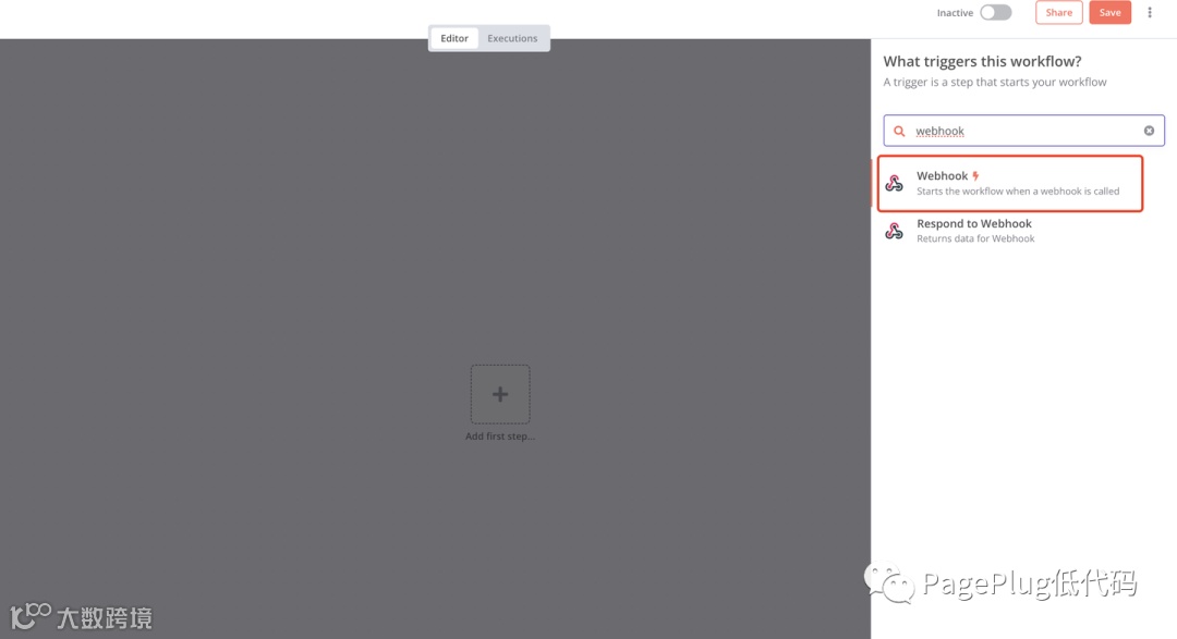 新建一个工作流工作区,点击中间的+号,搜索Webhook组件