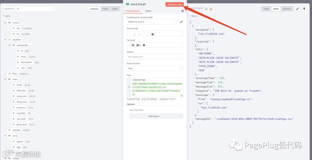 配置完毕后,点下右上角的Execute node,并在PagePlug中点一下api的运行,即可成功响应