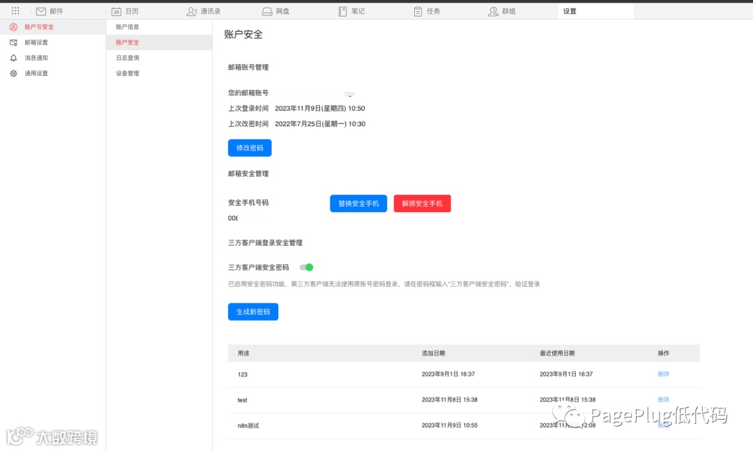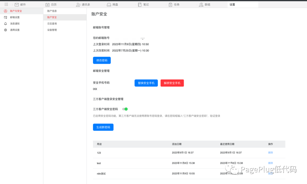 本次案例使用阿里云邮箱进行演示:在【设置】中,选择【账户与安全】——【账户安全】,即可生成Password