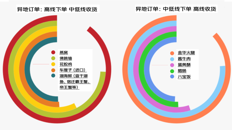 另外有意思的是,大量用户通过常用地址购买的商品,则以黄金珠宝、护肤/彩妆、室内装饰和方便菜为主。无论是布置自己的家庭,还是给本地朋友聚会、送礼,都是不错的选择。