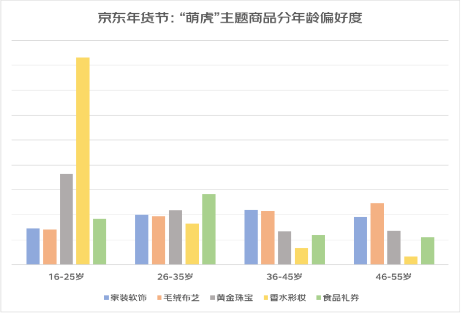 有趣的是,以往威猛的老虎如今以“萌物”的形象走红,12月以来含有“萌虎”元素的珠宝首饰成交额同比增长了85倍,服饰内衣成交额同比增长了14倍,而京东年货节开始后,“萌虎”相关商品销量再次大增,年货节后一周,虎年黄金珠宝的销量环比上周增长300%,其它毛绒布艺、香水彩妆、家装软饰等也有50%-70%的增长。