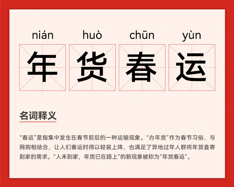 而与之相呼应的,是“年货春运”在节前20天起就已然热流涌动——是指人们通过网购等形式置办年货,既满足了回乡过年的人们轻装上阵的需求,也满足了异地过年人群将年货直接寄回家的需求。