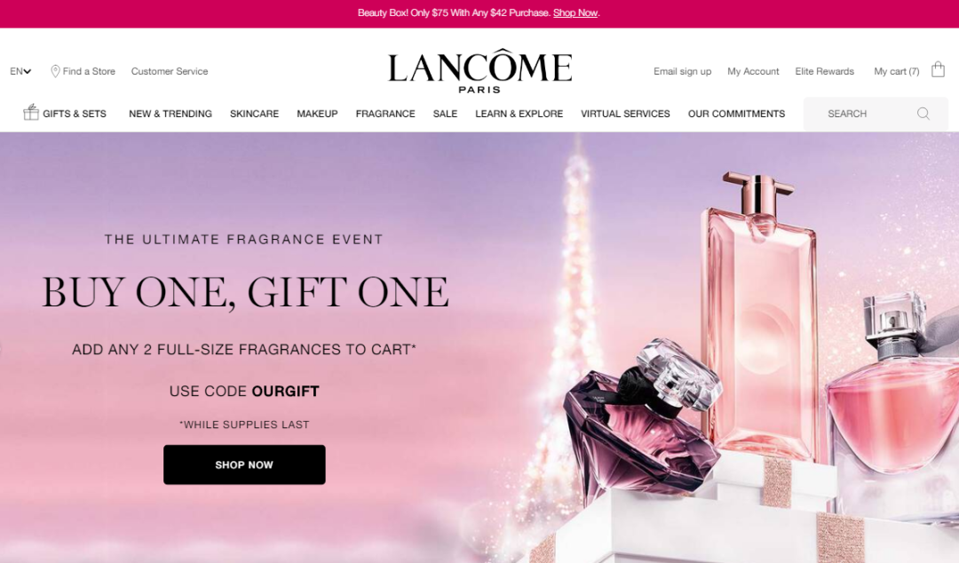 香氛专场买1送1,需要使用折扣码 OURGIFT 。(需要放2件香水在购物车)