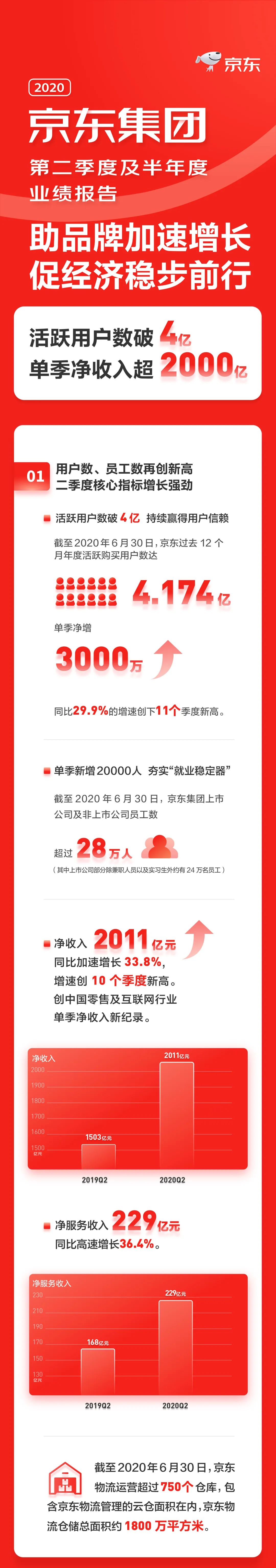 一张图看懂京东集团2020年第二季度及上半年业绩 活跃用户数破4亿 单季净收入超2000亿