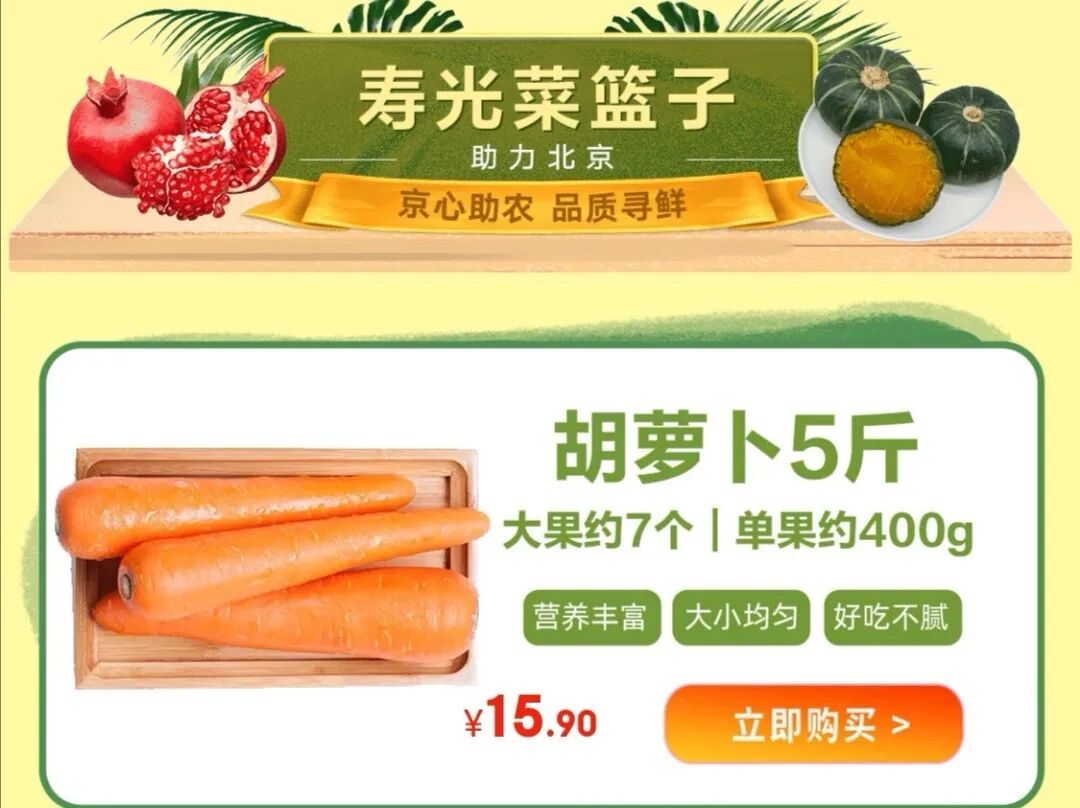 在京东买寿光蔬菜,不仅躺着下单还更优惠。此次直供北京的寿光蔬菜承诺“不涨价”,还有超20款鲜蔬低至七折。同时,用户还能get秒杀菜市场的超低价爆品:沙甜软糯的寿光土豆5斤到手9.9元,宝贝辅食必备的贝贝南瓜5斤19.9元!下单别着急付款,北京用户记得在会场领取寿光专属“菜券”,满减更优惠,从此让京东承包你的“菜篮子”!