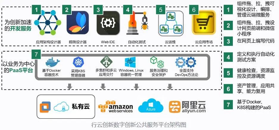 行云在设计数字创新公共服务平台产品的时候,主要关注两个方面,一方面为企业开发、测试和运维人员带来效率提升的开发者服务;另外一方面为企业业务的运行提供稳定的容器环境。