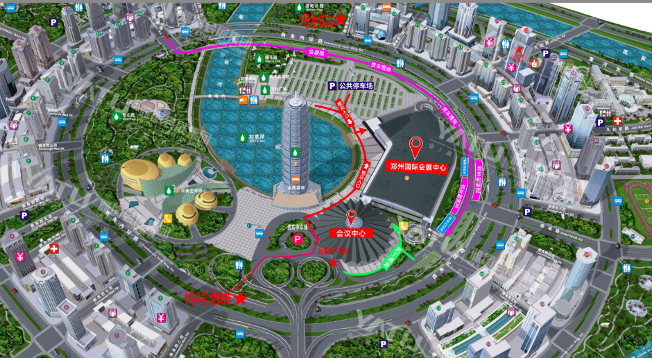 乘坐飞机、高铁、火车到达郑州后,可乘坐地铁1号线(从E2/E3口出)或5号线(从G1口出)到达会展中心。