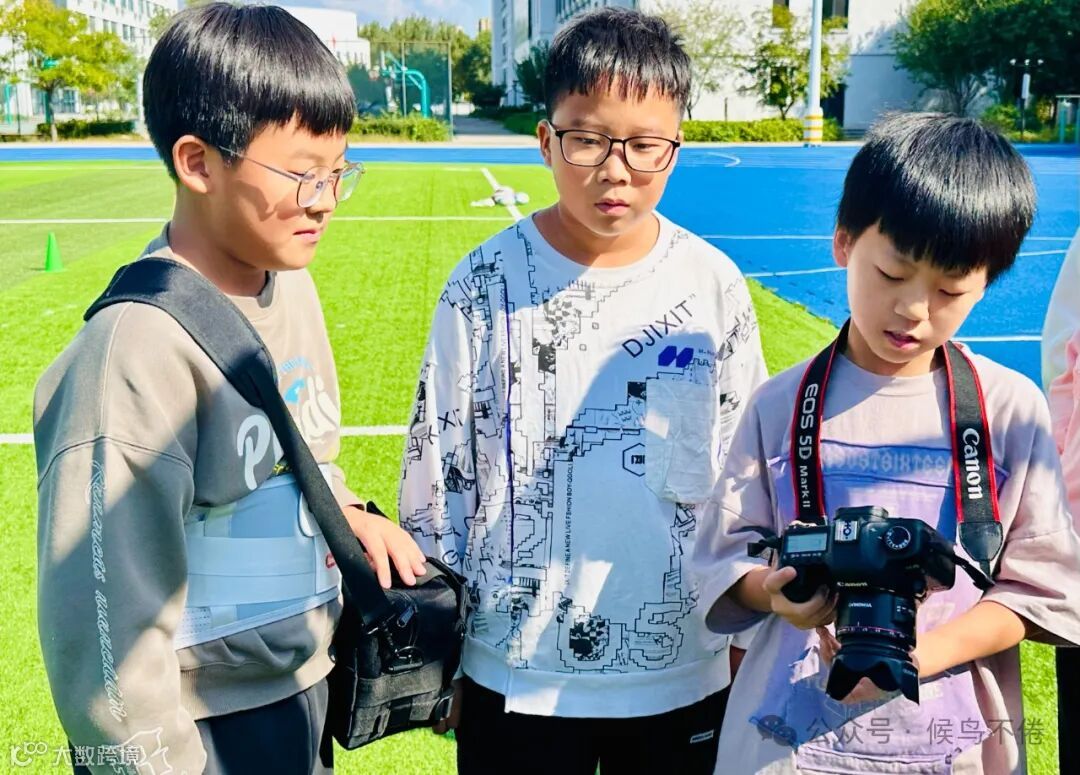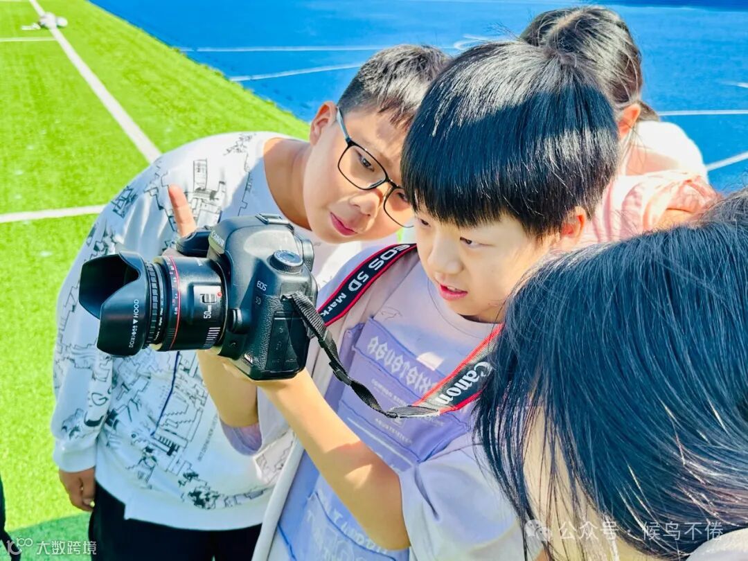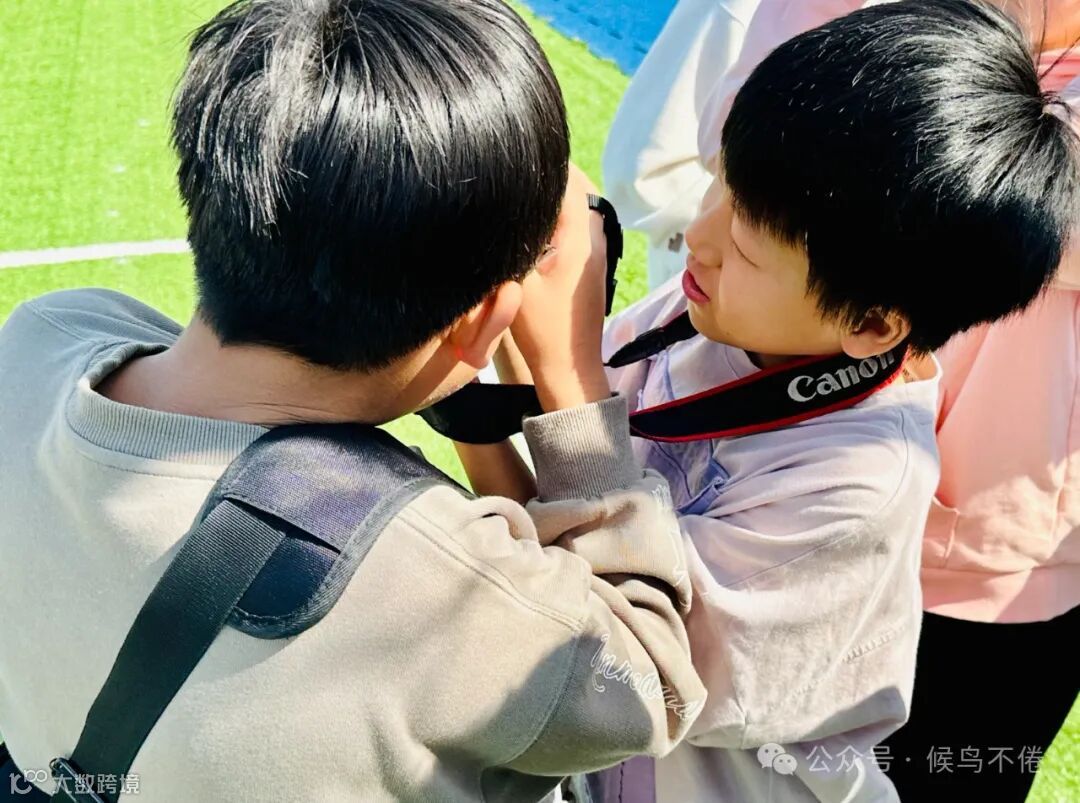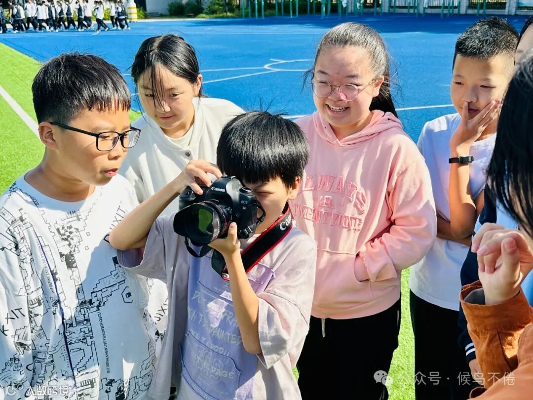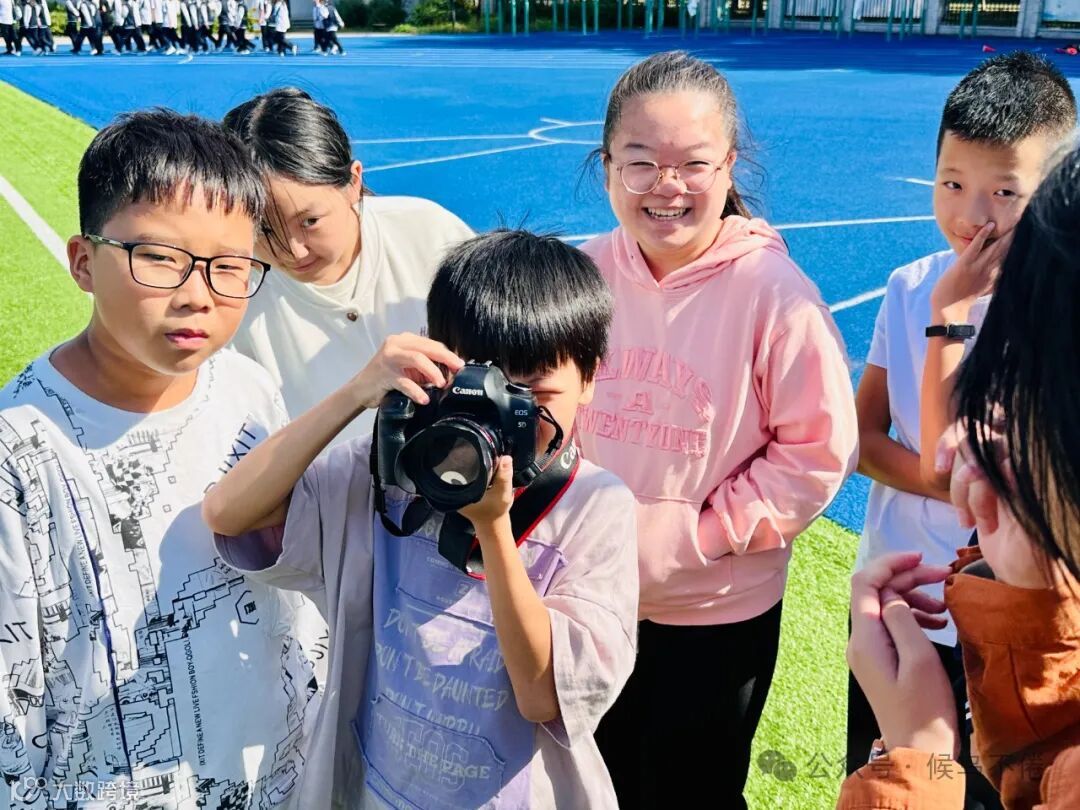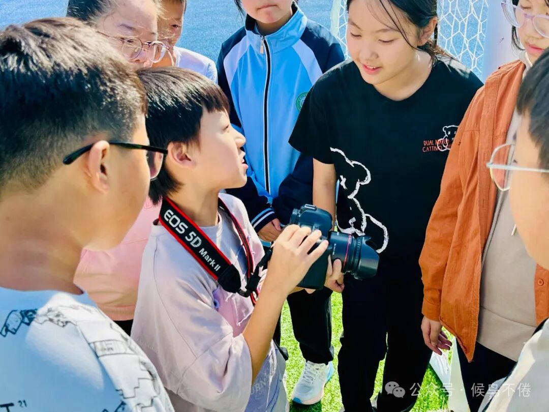 走出体育馆,远远看见刘莎莎老师负责指导的橄榄球社团。队员们成了摄影社团的免费人像模特。团长唐悦淇小朋友,也是六年级,一边端着相机,一边忙着讲解。贾老师凑过去,申请拍照。