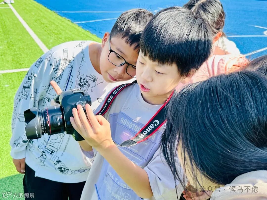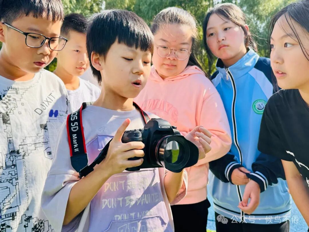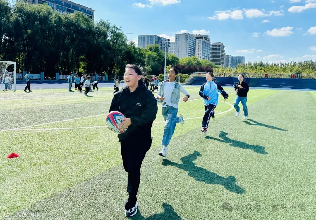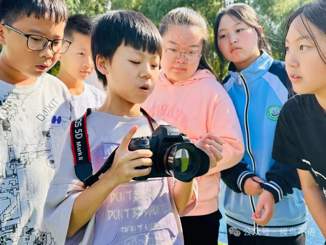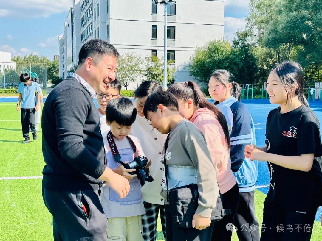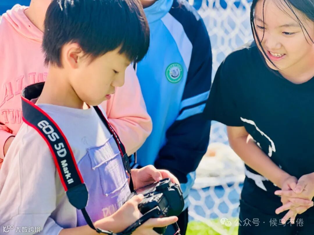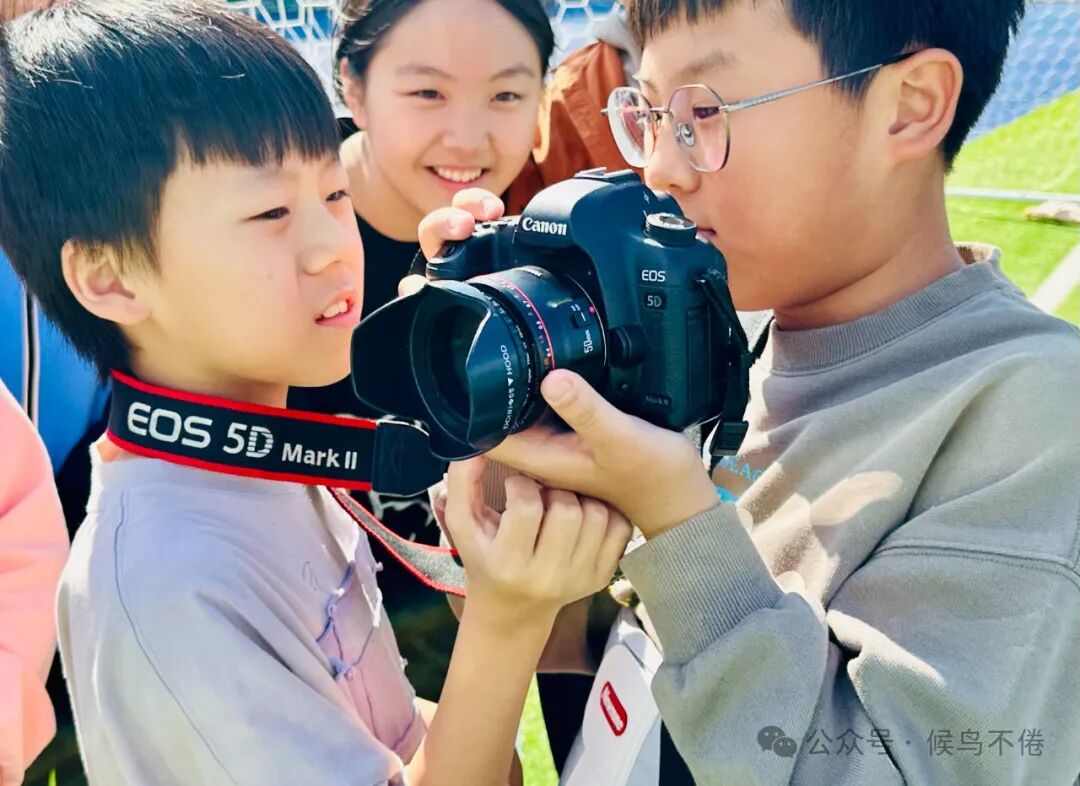 走出体育馆,远远看见刘莎莎老师负责指导的橄榄球社团。队员们成了摄影社团的免费人像模特。团长唐悦淇小朋友,也是六年级,一边端着相机,一边忙着讲解。贾老师凑过去,申请拍照。