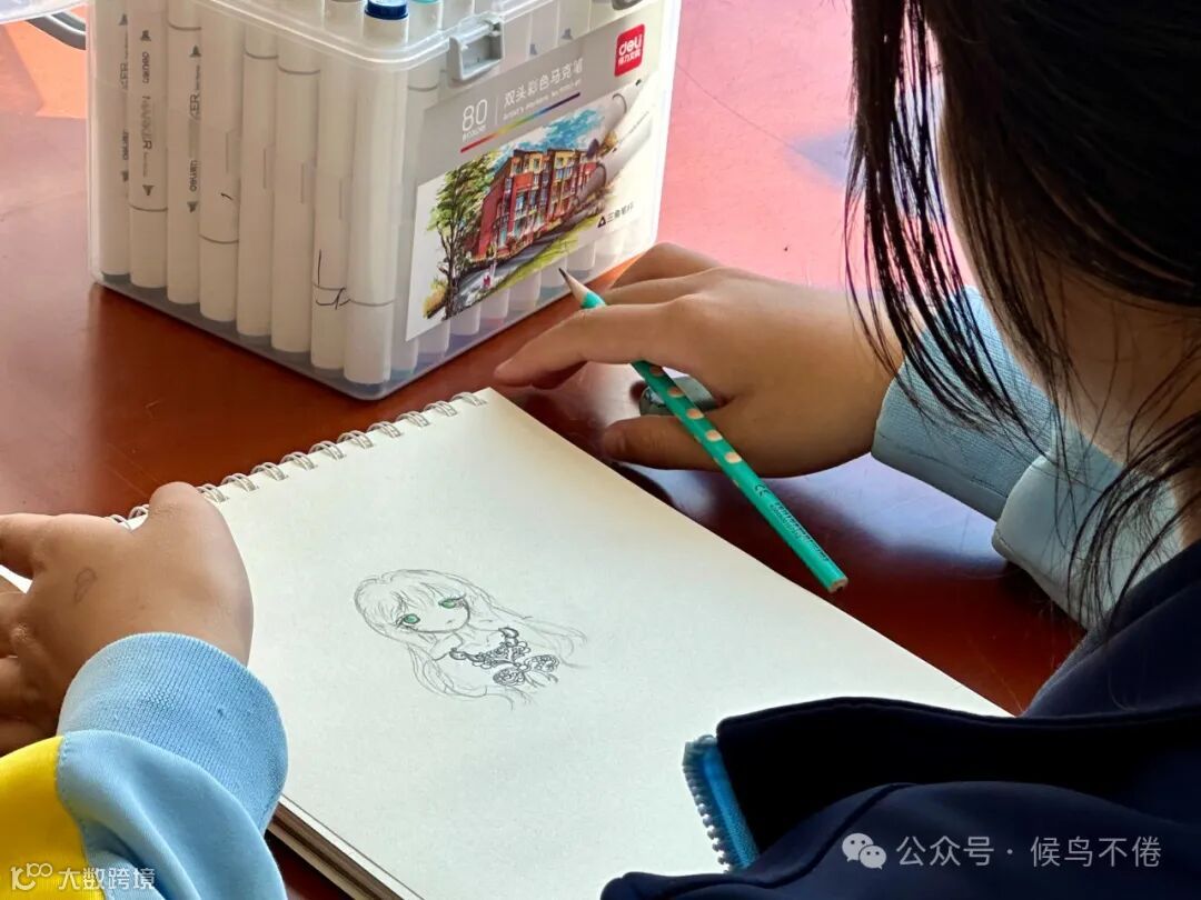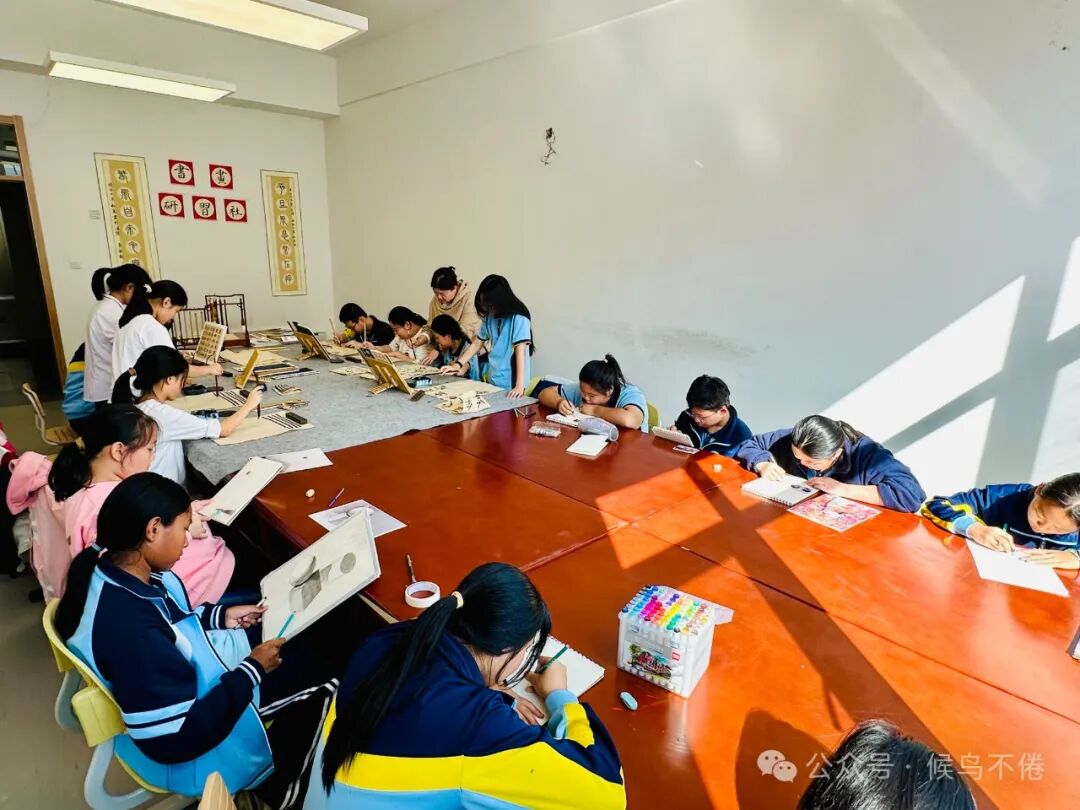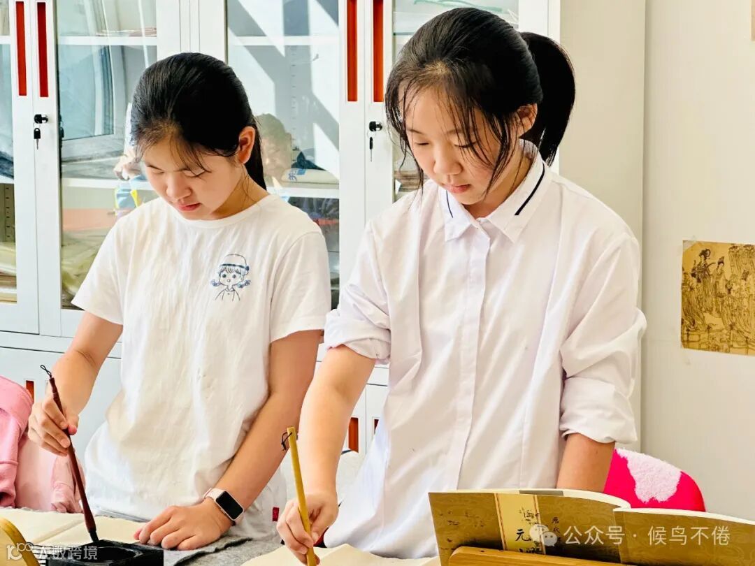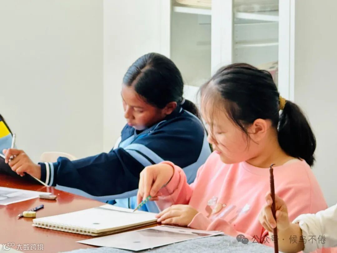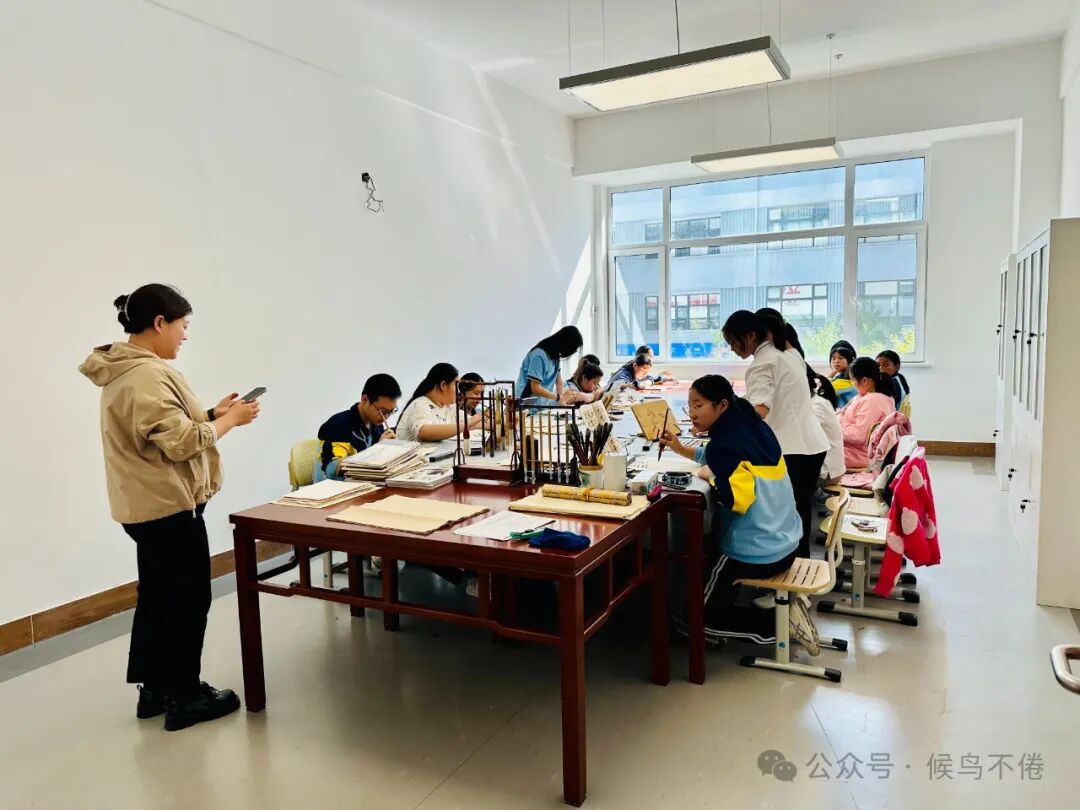 所有社团中,“待遇”最高的当属李欢欢老师负责指导的书画研习社,她和孩子们有一间专属的社团活动室。欢欢老师的手机播放着《欢乐颂》作为背景音乐,正午的阳光透过玻璃窗,洒在孩子们的脸上。