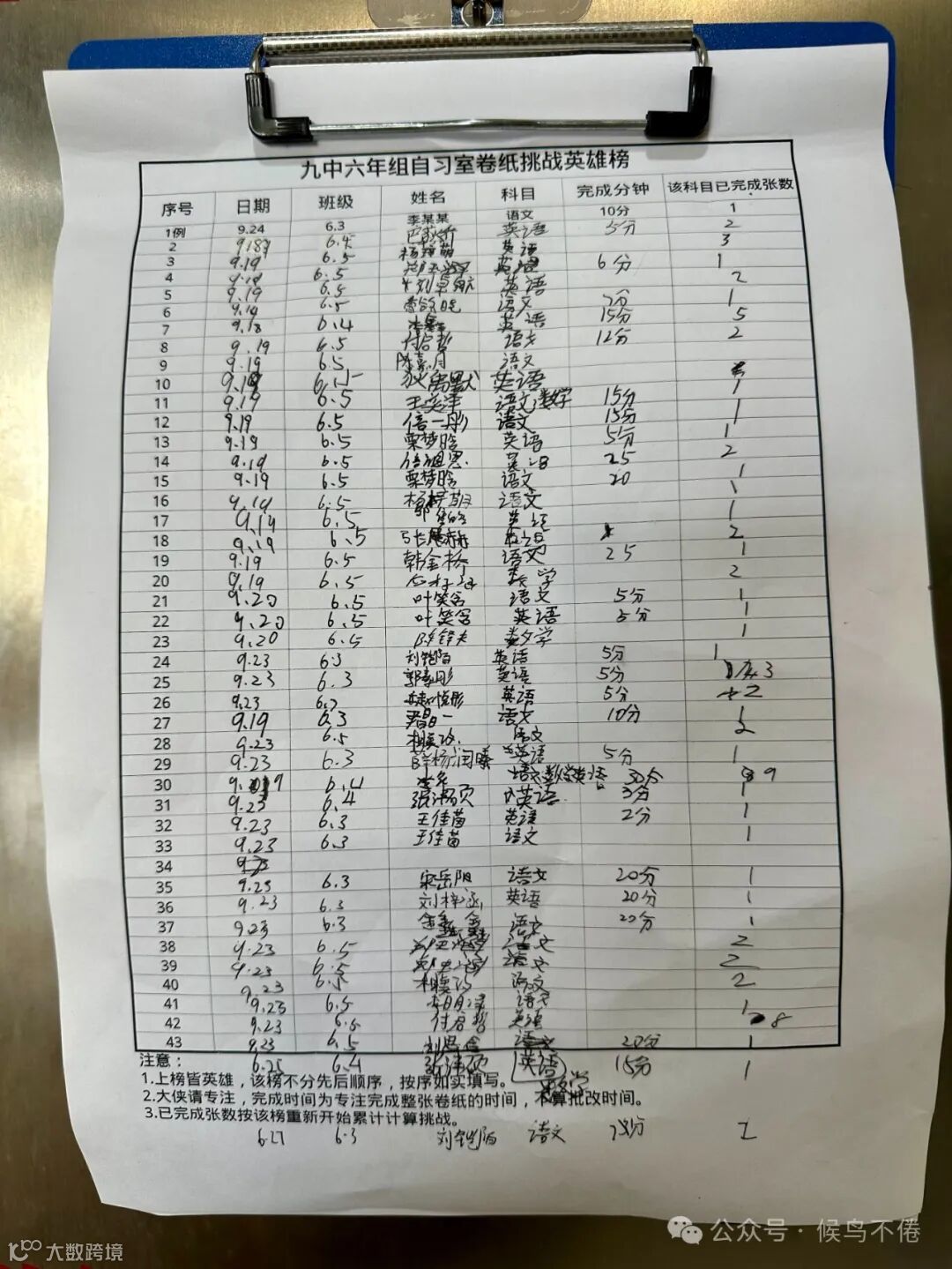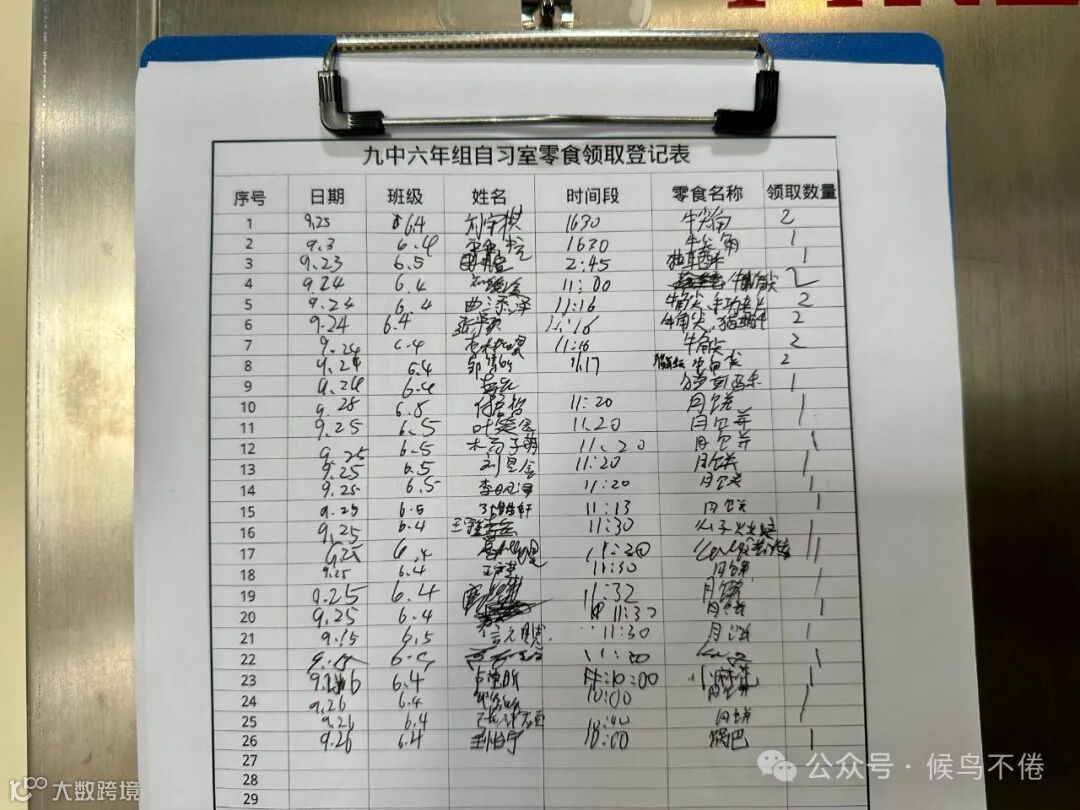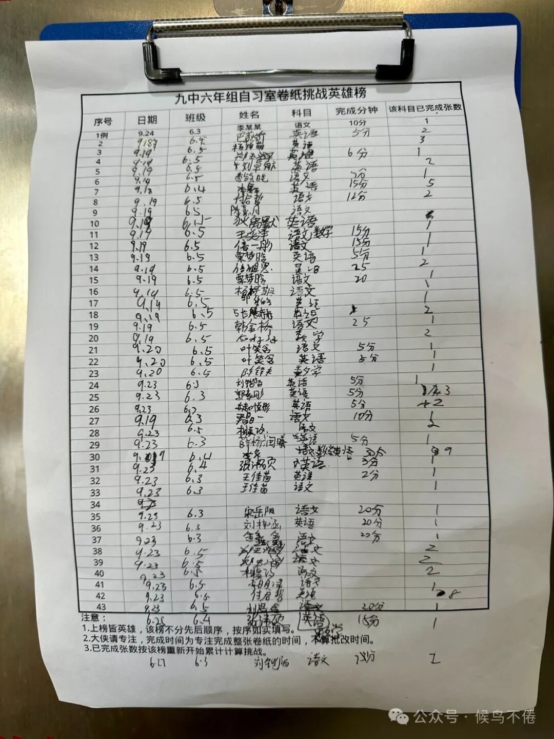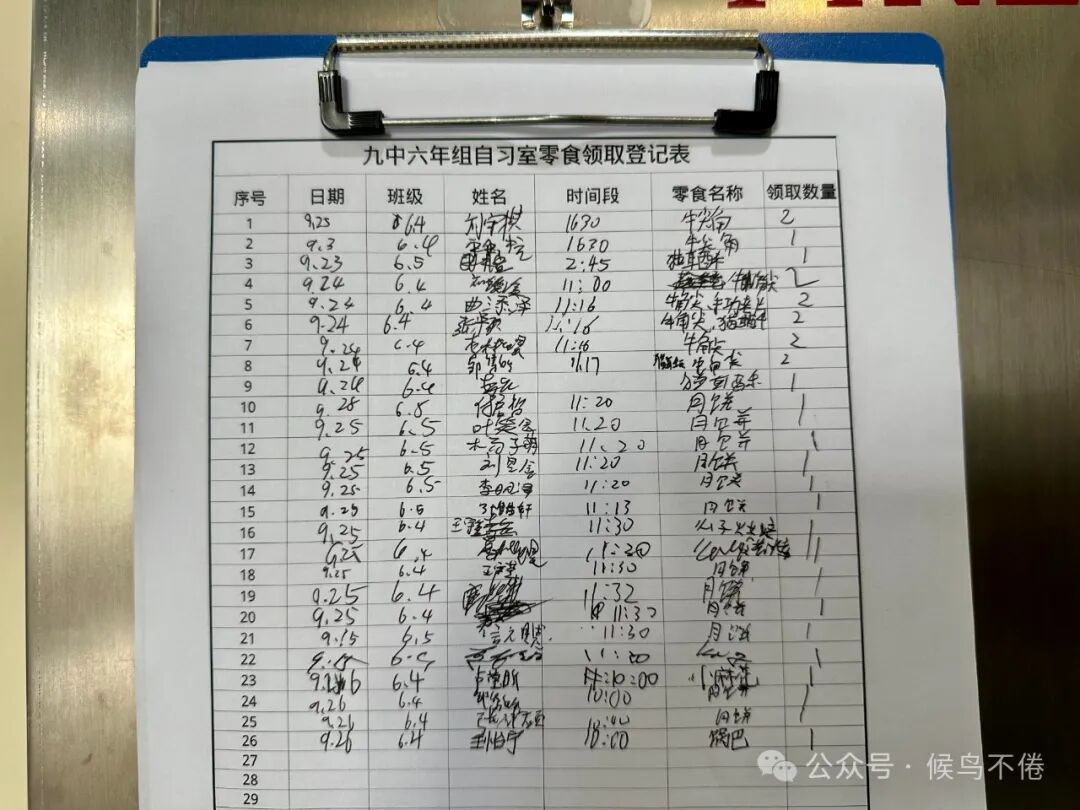 我和贾老师等不急,我们想去看三国杀,可惜没赶上,还有十分钟上课,孩子们已经开始“收摊”了。我只能欣赏墙上的“六年组试卷挑战英雄榜”和“六年组自习室零食领取登记表”。