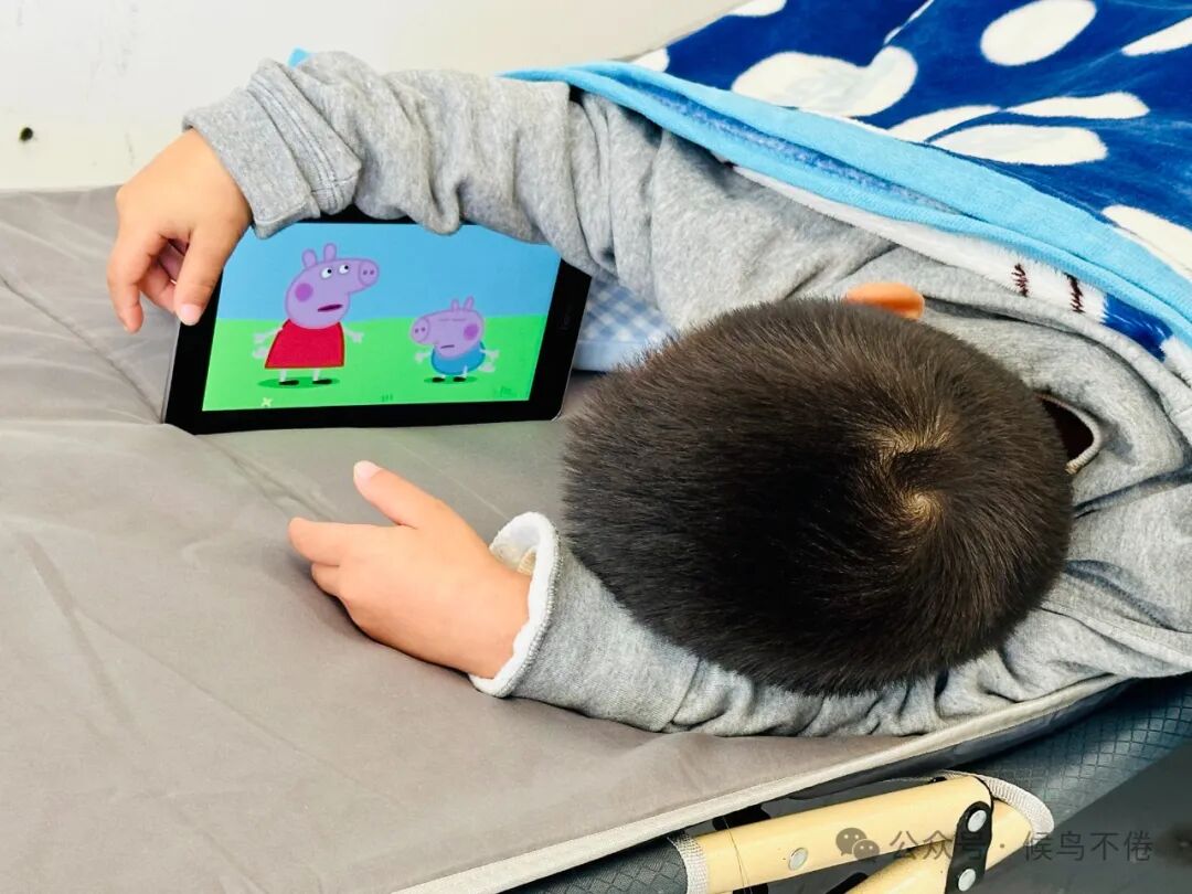 我走过去,才发现小家伙没睡,抱着PAD看动画片呢。用手摸摸小贾的额头,还略微有些热。