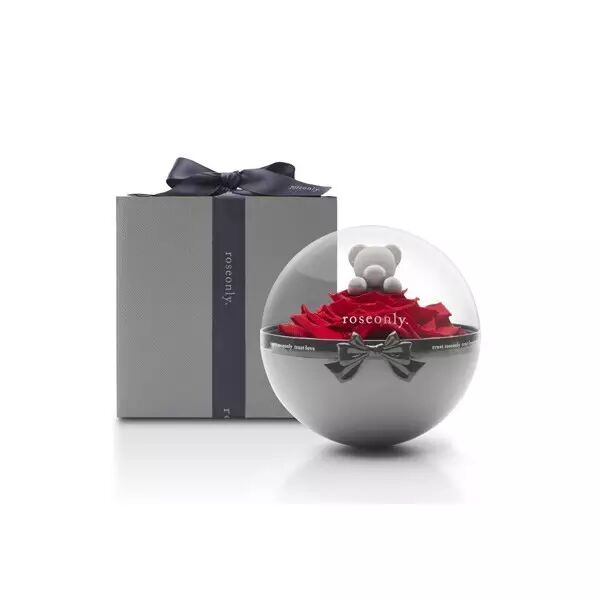 设计师以浩瀚宇宙中的星球,独创能够旋动的玫瑰花球。永不凋零的玫瑰,透过晶莹剔透的礼盒绽放于世人面前。roseonly广受欢迎的经典玫瑰花球系列,加入可爱的绒毛小熊,精致可爱的小熊从玫瑰花丛探出,寓意让我像小熊一样呵护你、陪伴你。