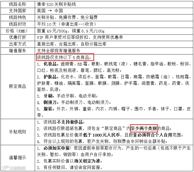 上周“情牵520关税补贴线”推出后受到广大用户的关注,许多人问到新线路的优势是啥,我自己觉得是数量和重量上更灵活了,前提必须是指定5类商品的混装。